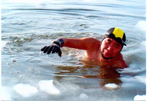 This picture was taken at Dalian, China. The temperature of the water is -2 C. The swimmer swim 48 minutes in that water.